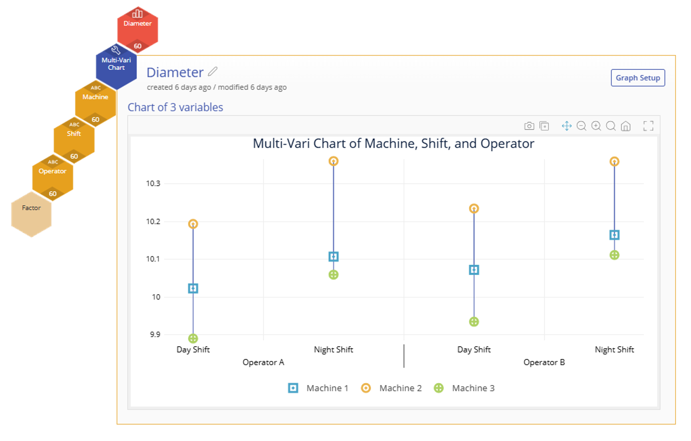 Multi-Vari Charts bring a simpler way to analyze the effect of categorical factors on an output. Visualize the variation between different levels of your inputs and understand which one gives you the best result.