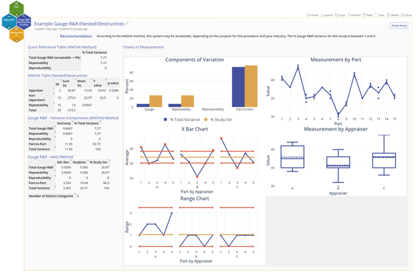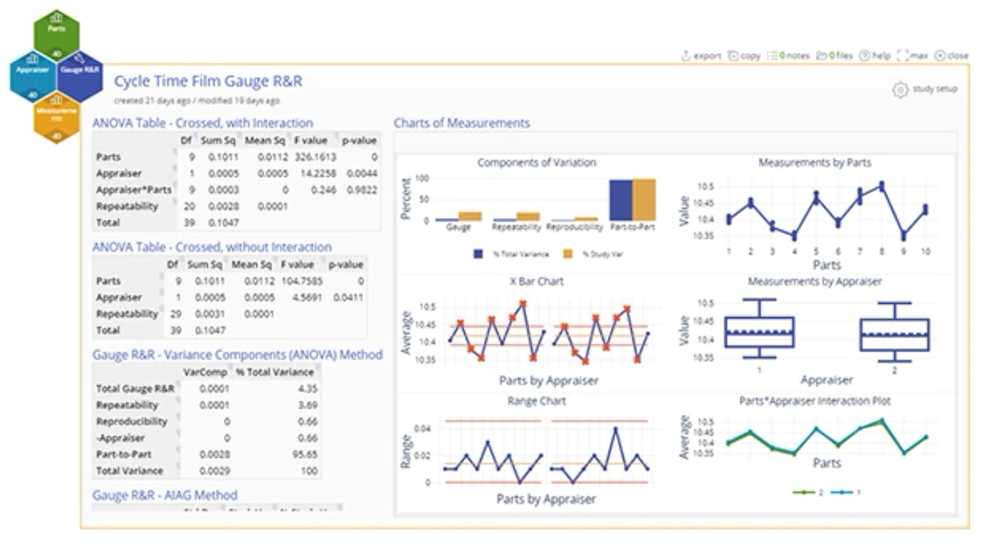 - Differentiates measurement variation due to operators, parts, and gauge.