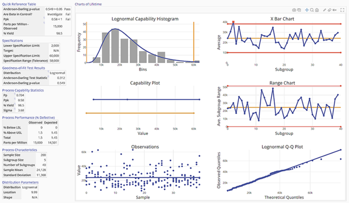 - Non-Normal Process Capability - Continuous: Run a Process Capability two ways — fit a distribution or use raw data by selecting Empirical Analysis.