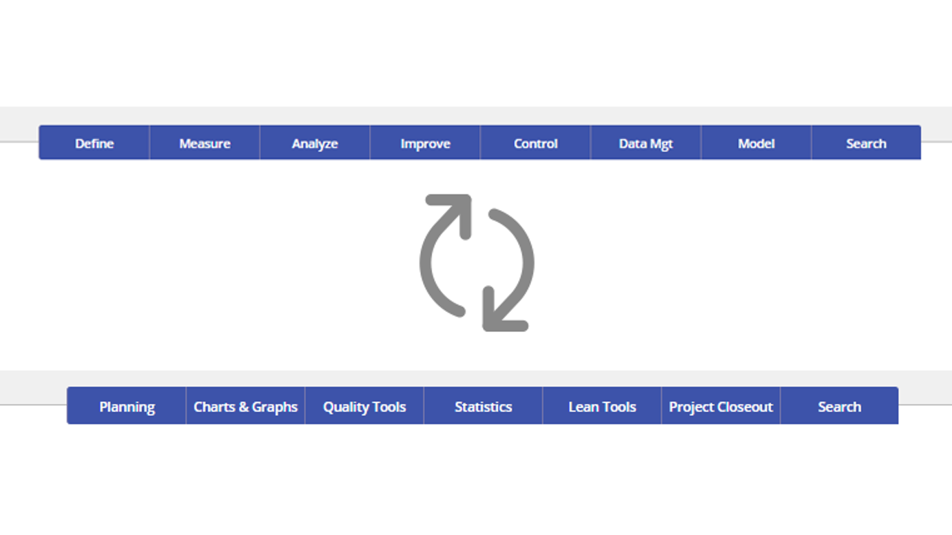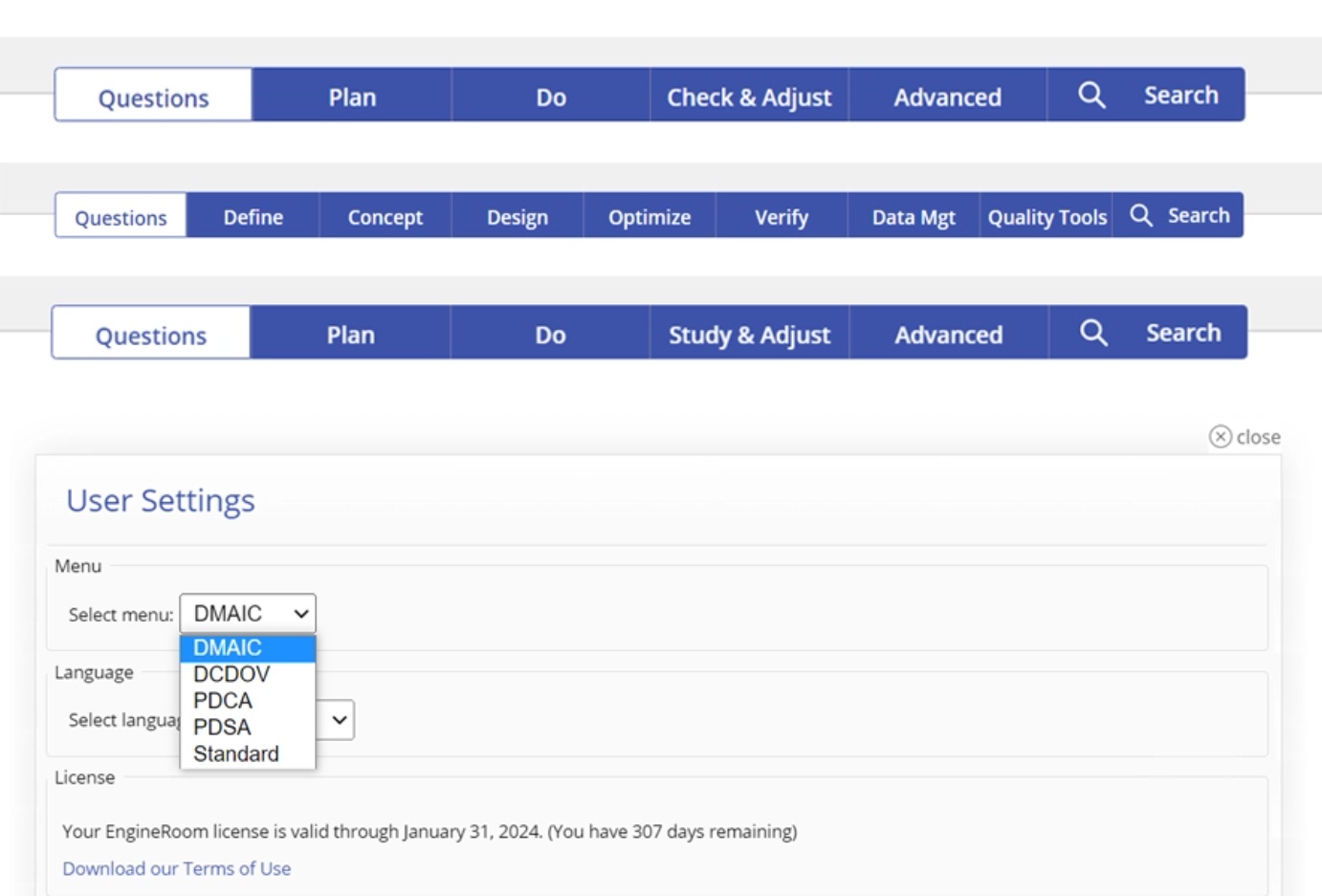 The default DMAIC menu organizes tools by phase of a DMAIC project. The new Standard menu organizes the EngineRoom toolbox by function, including Planning, Statistics, Lean Tools, and more.