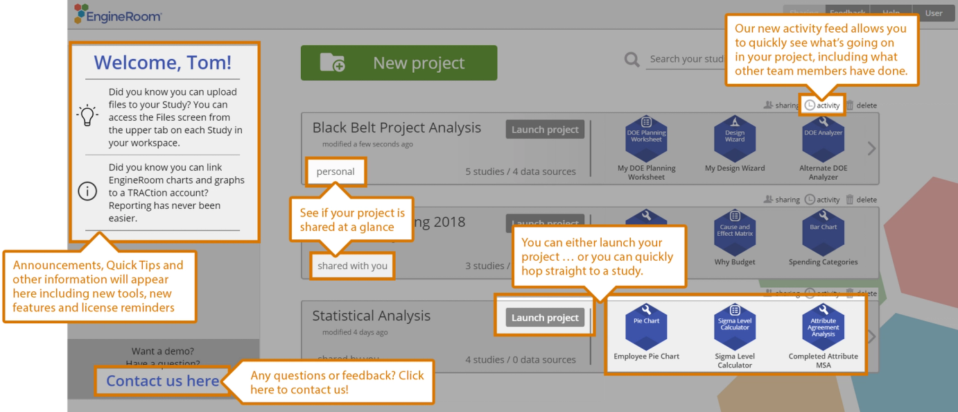 Take a look at the new landing page that provides a master view of your project work. It's a more visual way to display your project list and provides quicker, more visible access to your studies. There is also a new section for announcements, reminders, and helpful information.