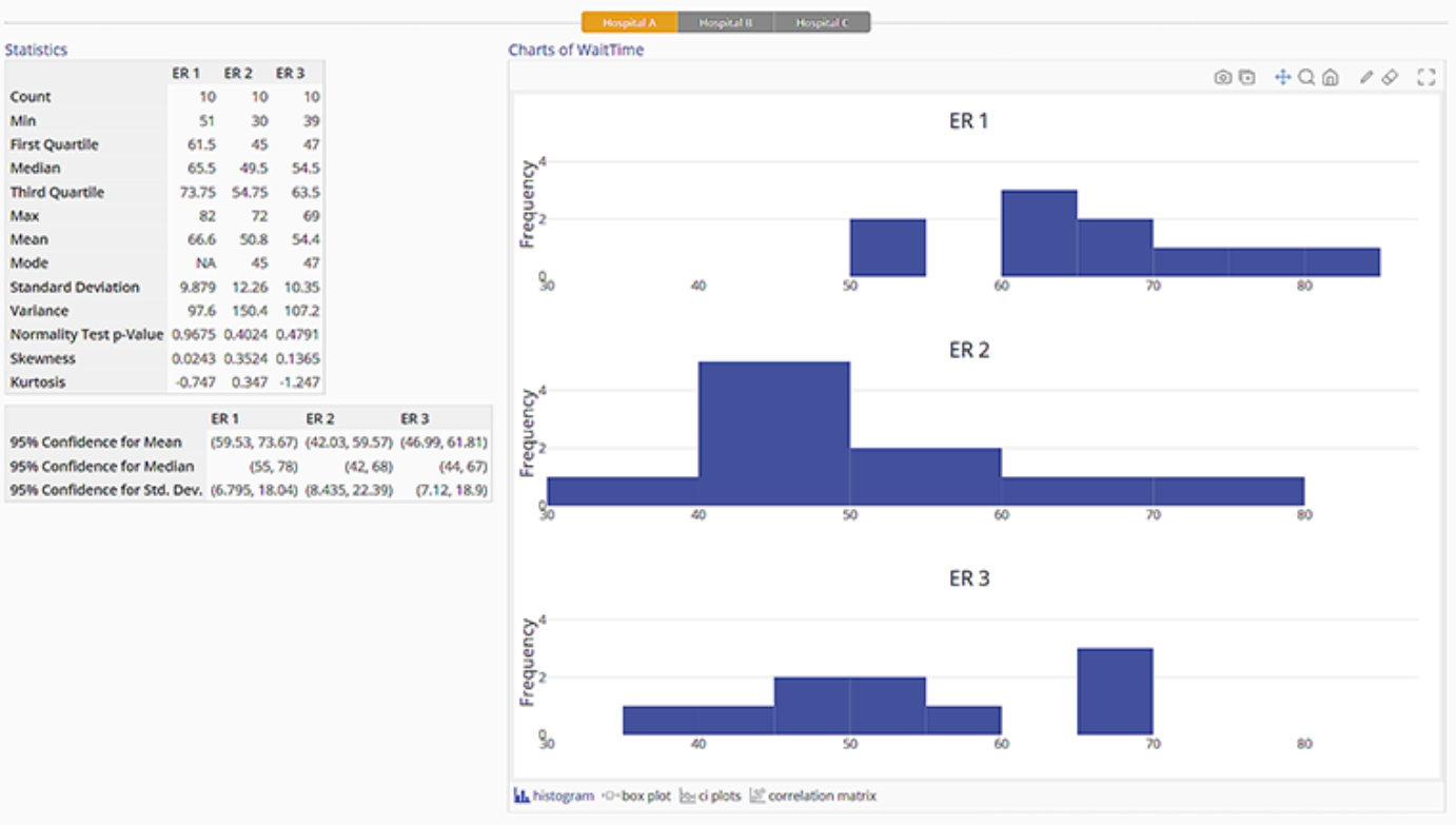 - Includes histograms, box plots, confidence interval plots, and correlation matrices in one tool.