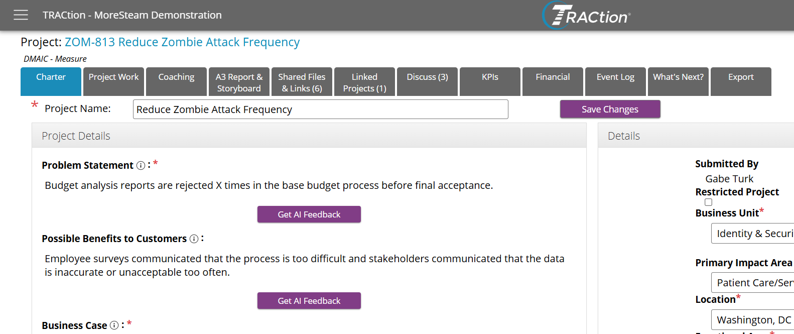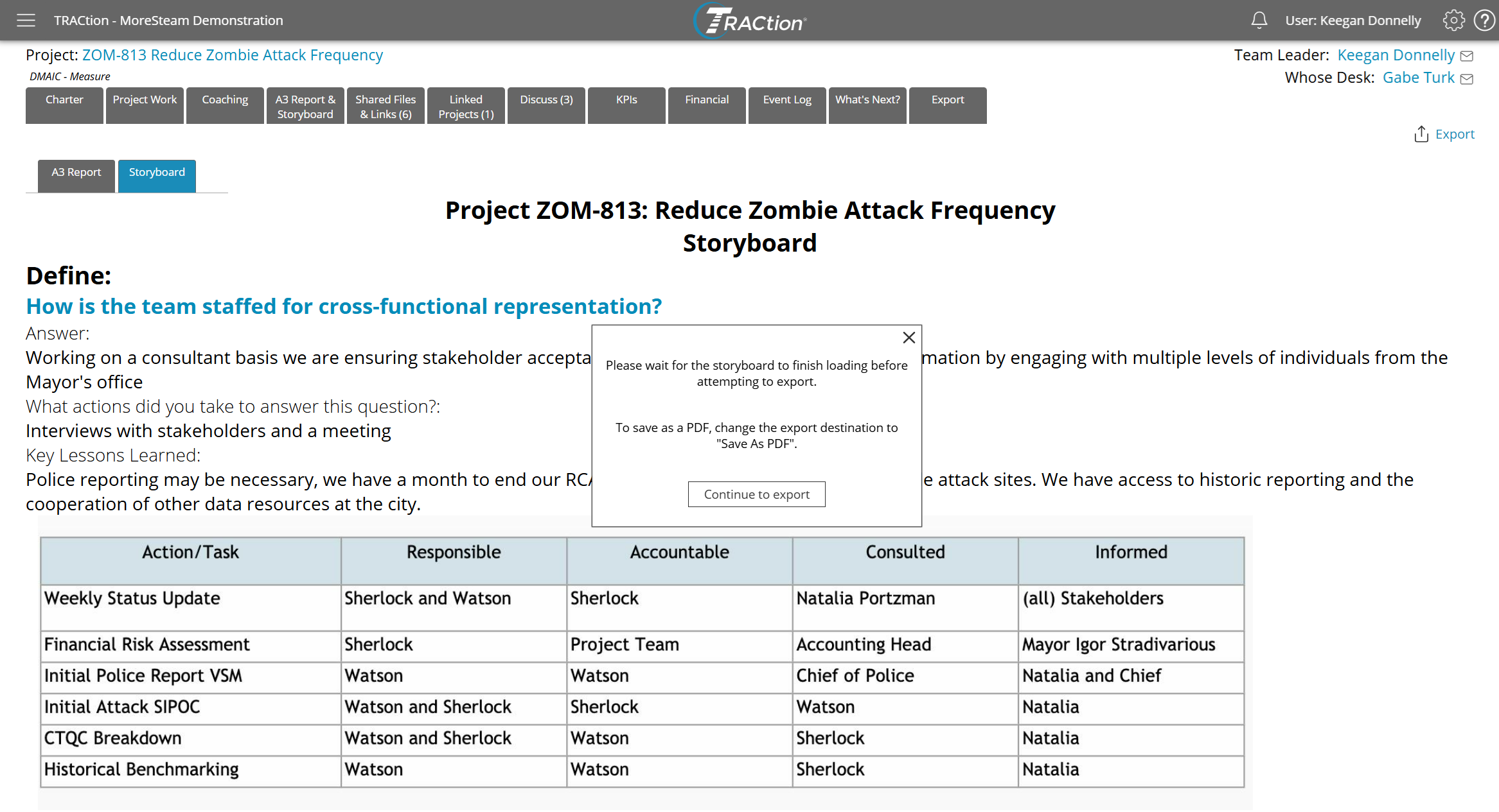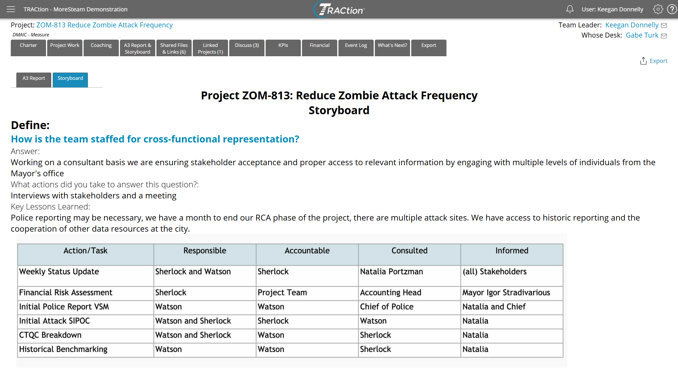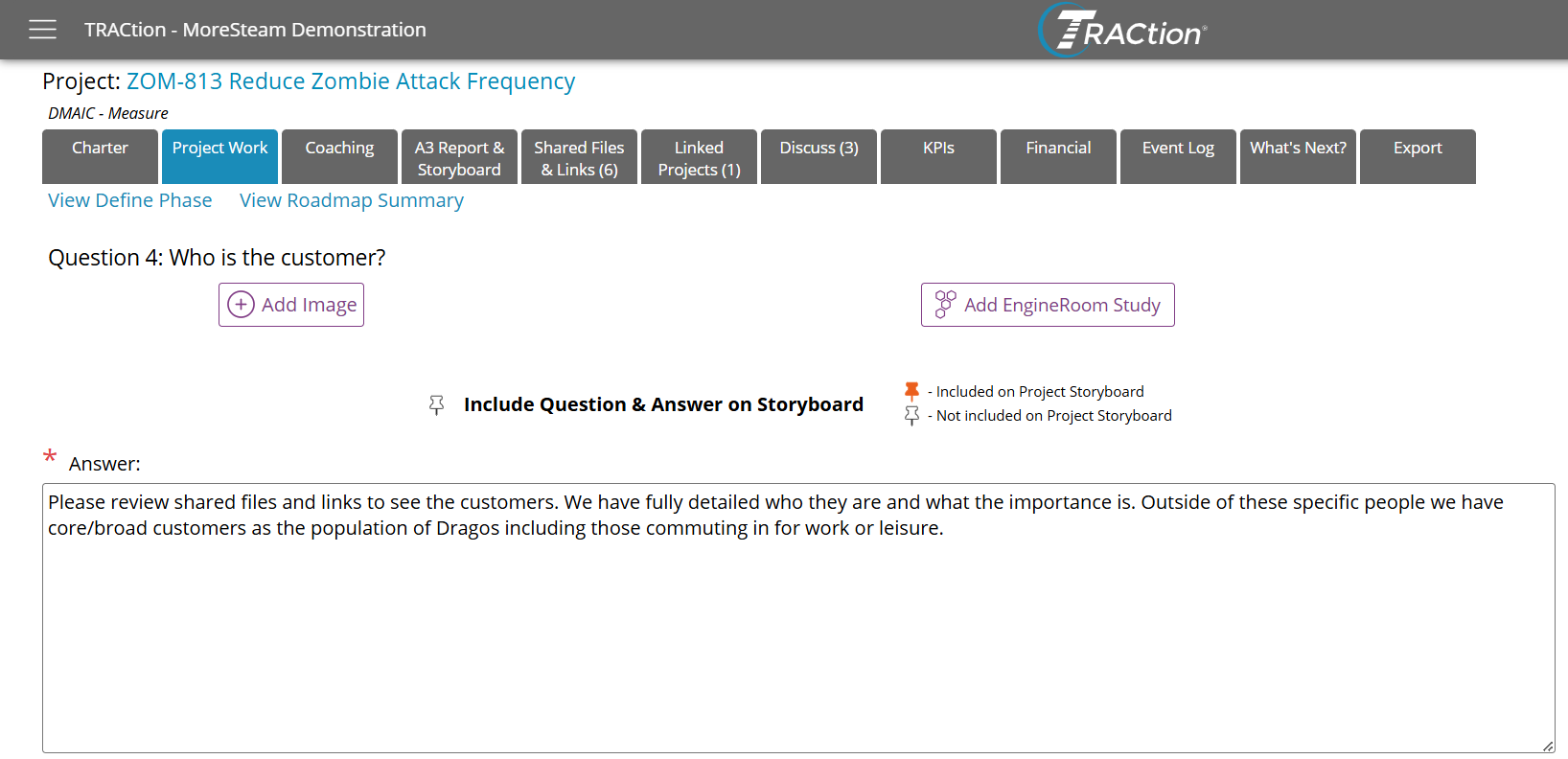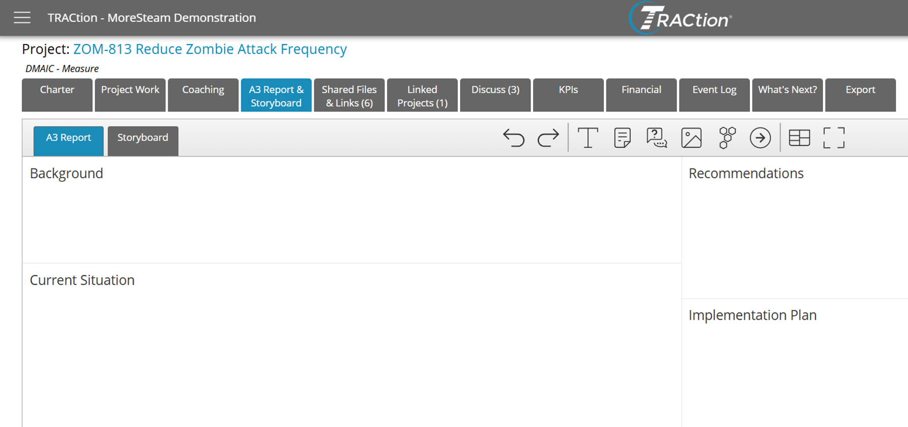 To access the Project Storyboard, open a project and select the “A3 Report & Storyboard” tab.If A3 Reports are not enabled in your TRACtion instance, you should see a “Storyboard” button instead. If Storyboards are not enabled, the tab will not be visible. If you think they should be enabled, please reach out to your TRACtion administrator. By default, the “A3 Report & Storyboard” tab will navigate you to the A3 Report. From this page, click “Storyboard” to access the project Storyboard.