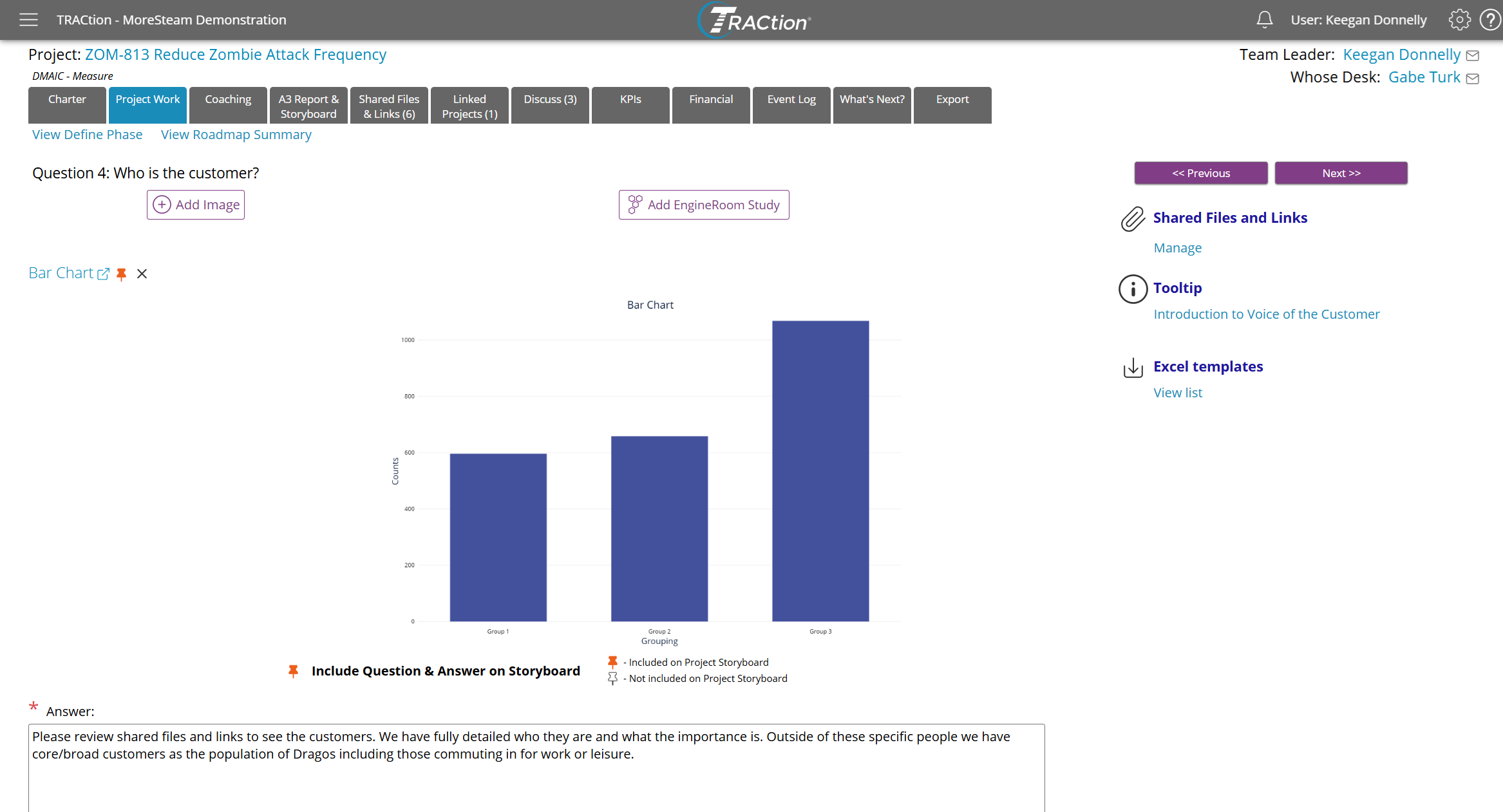 The Project Storyboard includes any question and answer that has been included from the Project Work page. Clicking the question will take you directly to the question on the project if you would like to make modifications or access any additional artifacts.