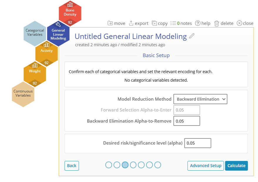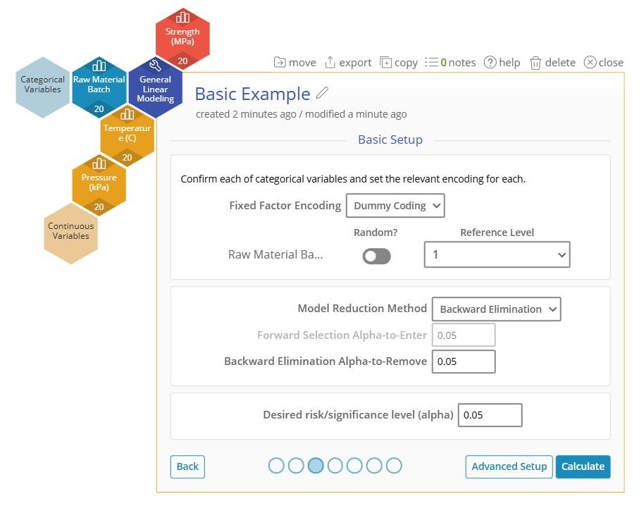 3. One new feature of GLM is the addition of multiple Model Reduction Methods. For this example we will leave on "Backwards Elimination" with an alpha-to-remove of 0.5 as the default.