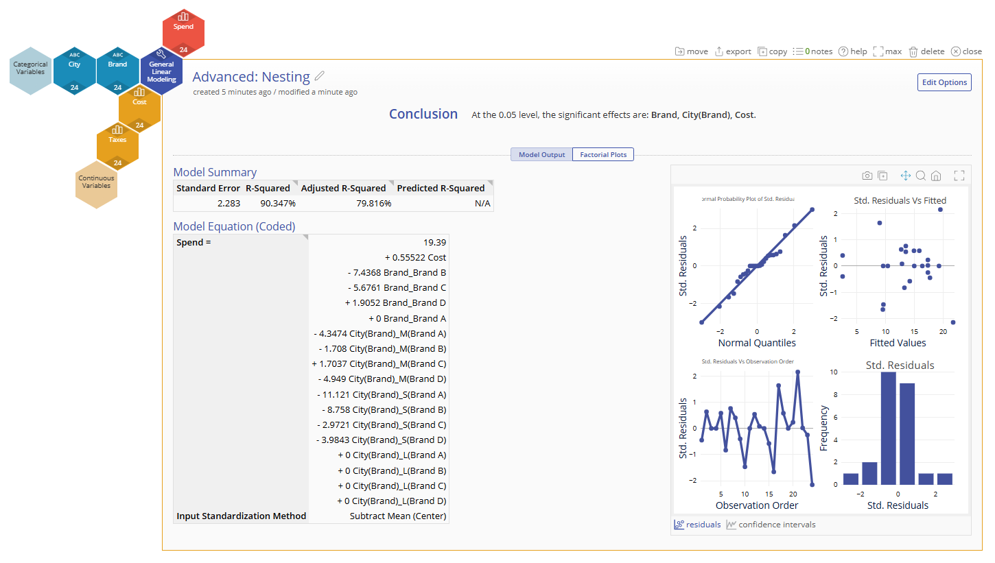 Our model shows good fit to the data and includes all model terms. Notice that the term for Rack is "Rack(Oven)". This is the parentheses nomenclature to represent Rack being nested in Oven.