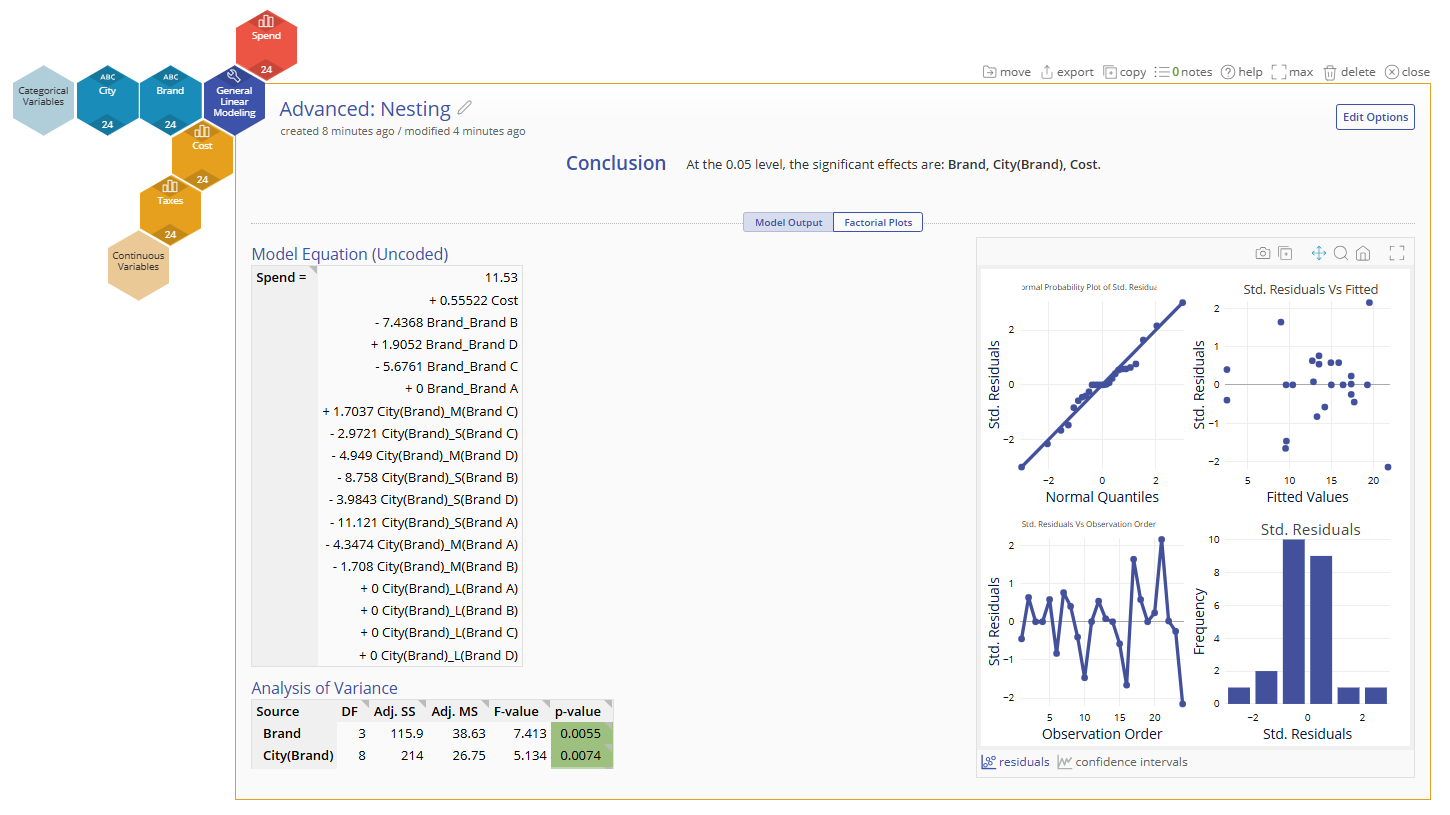 - ANOVA table breaking down the significance of the terms in your model. The significant terms are highlighted in green.