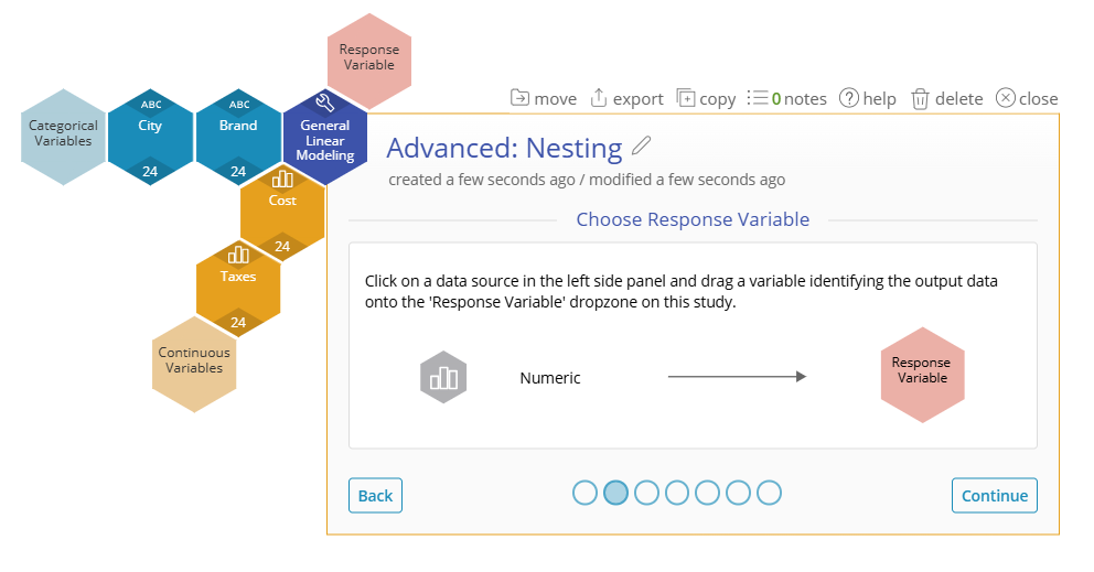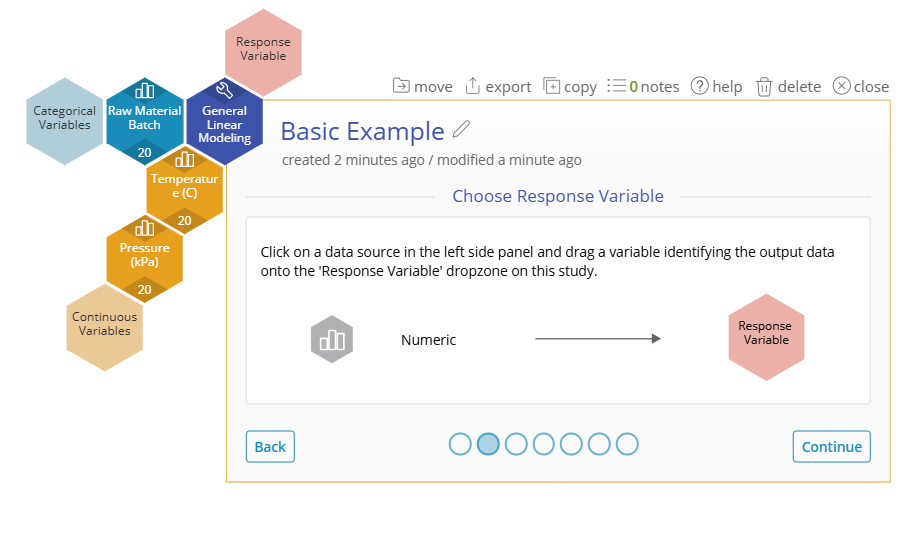 2. Drag Temperature and Pressure onto the Continuous Variables Dropzone, select "Continue", and then drag Strength onto the Response Variable Dropzone.