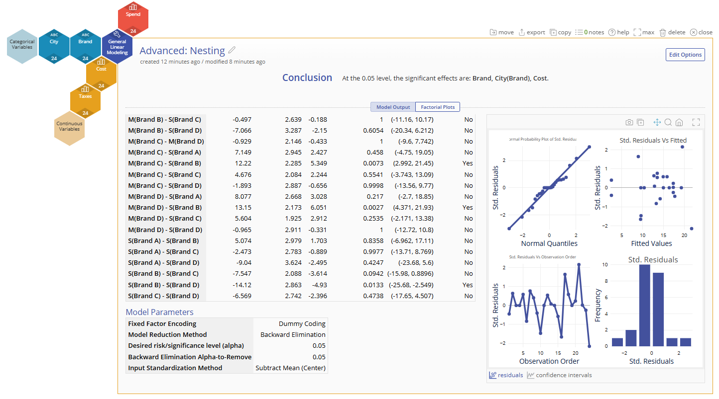 We can interpret the model similarly to how we have in the previous examples. The "Tukey Adjustment" table for differences in our categoric variables and the "Factorial Plots" are new focuses of this output.