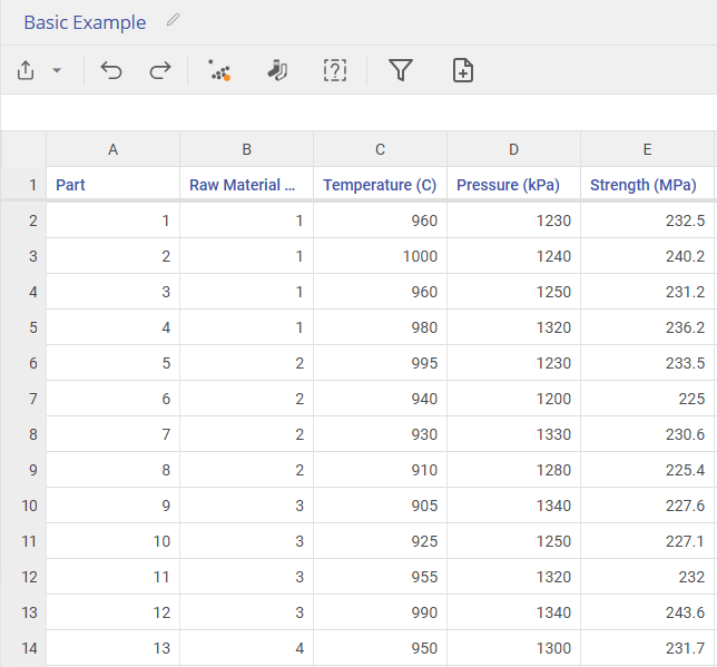 Our first dataset is from a manufacturing process where we are analyzing the effects of Temperature and Pressure on Strength. In our dataset, we have 5 measurements per Raw Material Batch. It is known that strength can vary based on raw material batch, but there is no way to predict exactly what strength the next batch will have, they follow a random distribution.