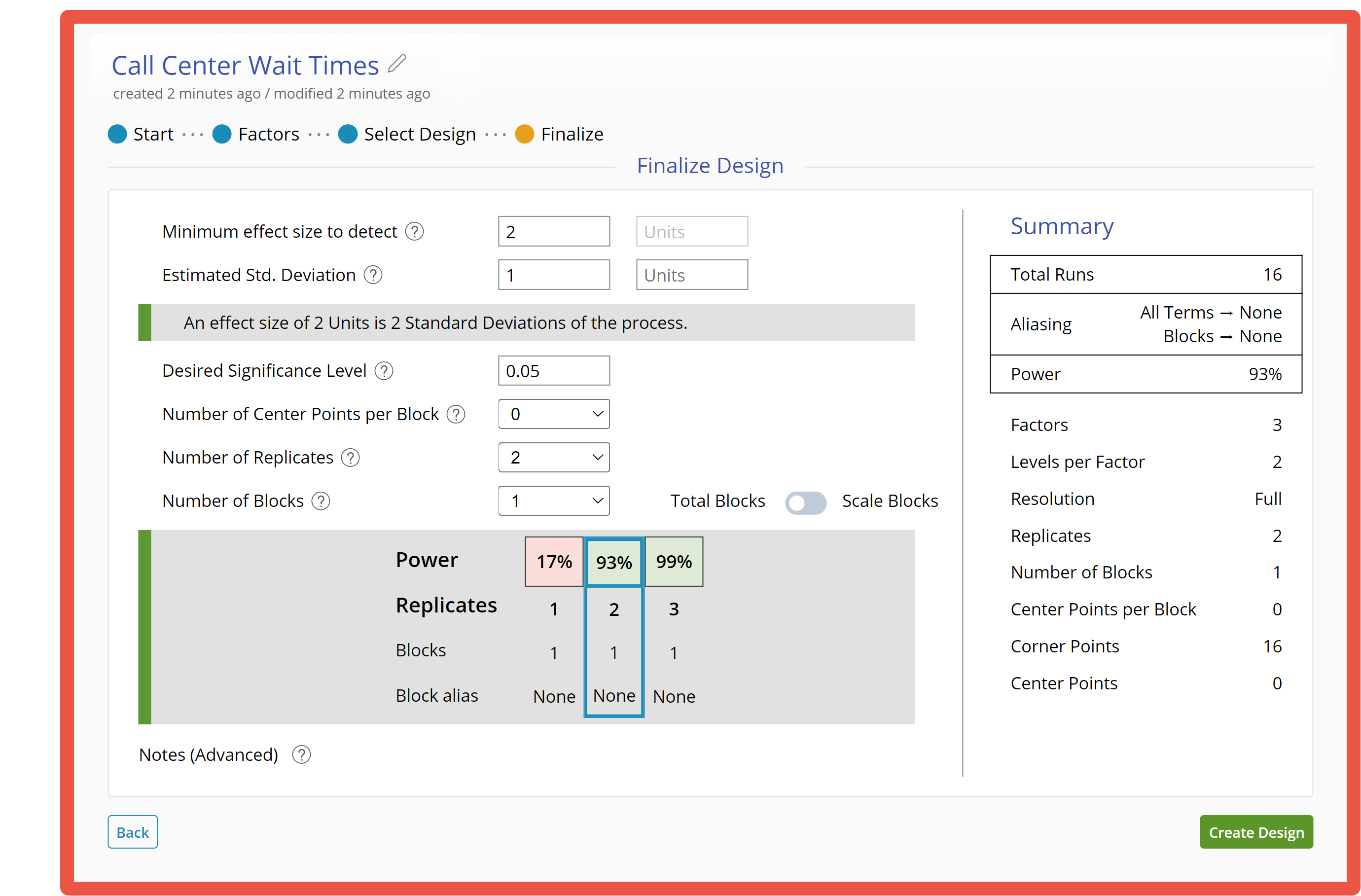 Pick the options that guarantee that your experiment is powerful enough. The options screen shows how your choices affect the resulting power.