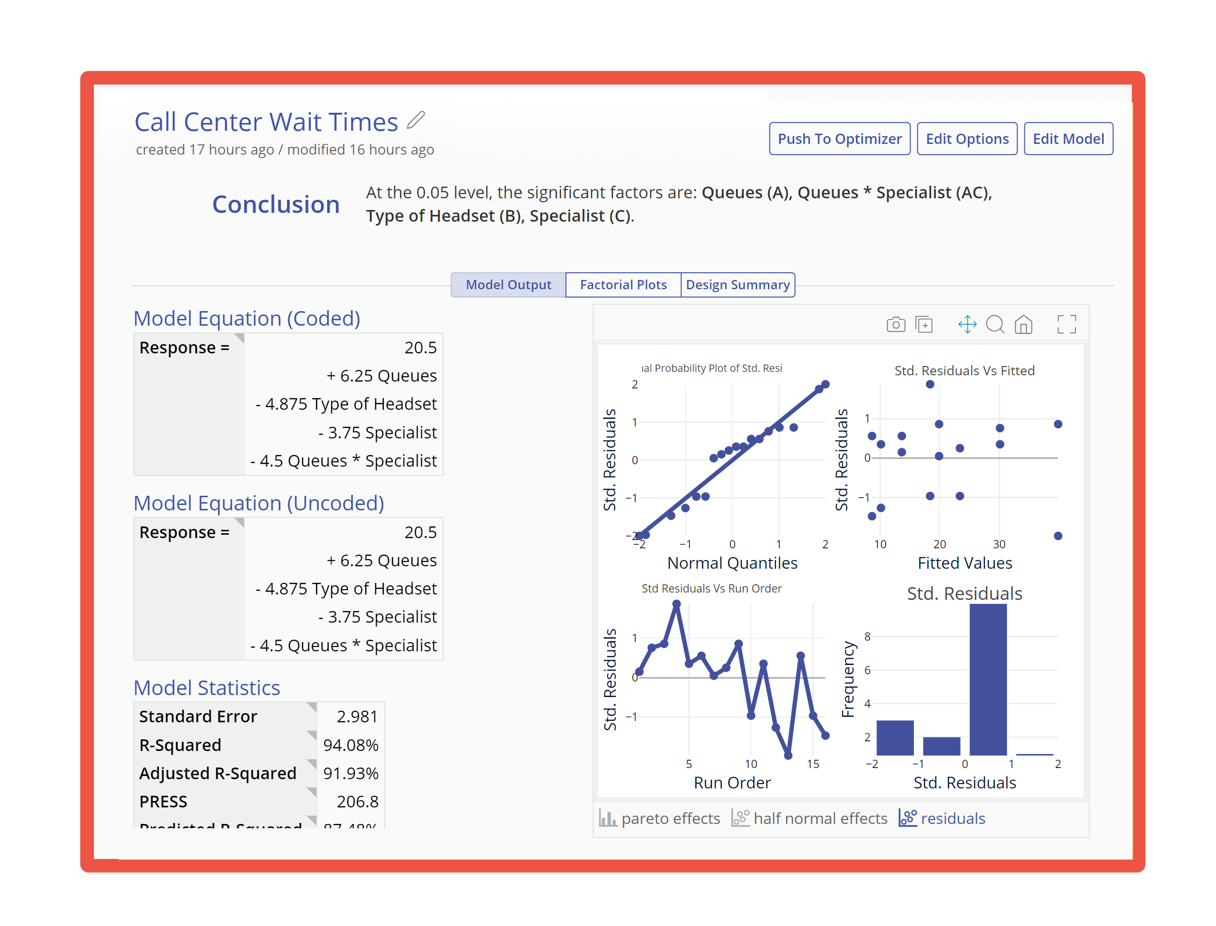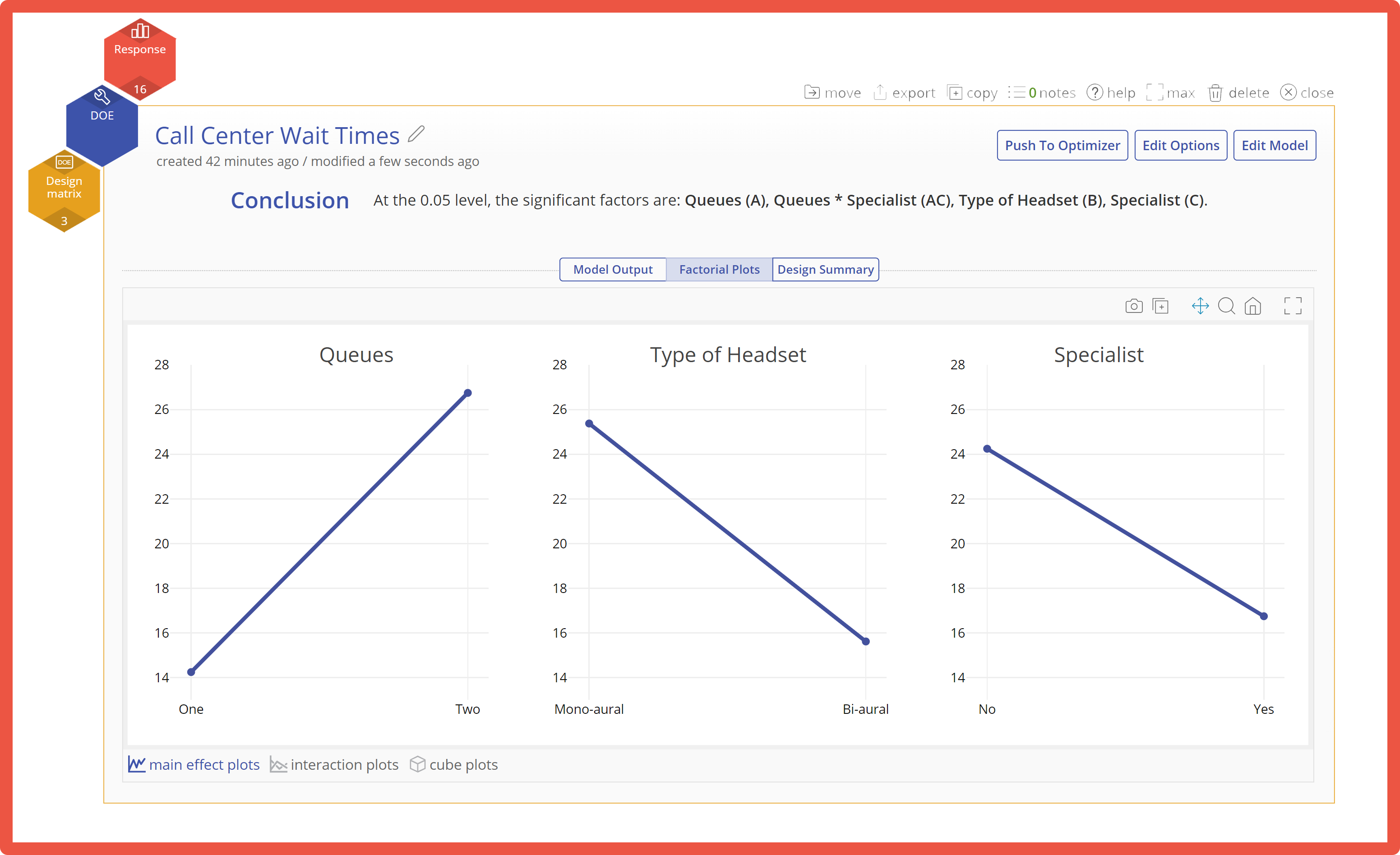 Results output includes a conclusion on which factors are considered significant at the level you have chosen. In addition to calculating a model and statistical tables, EngineRoom's DOE tool includes: