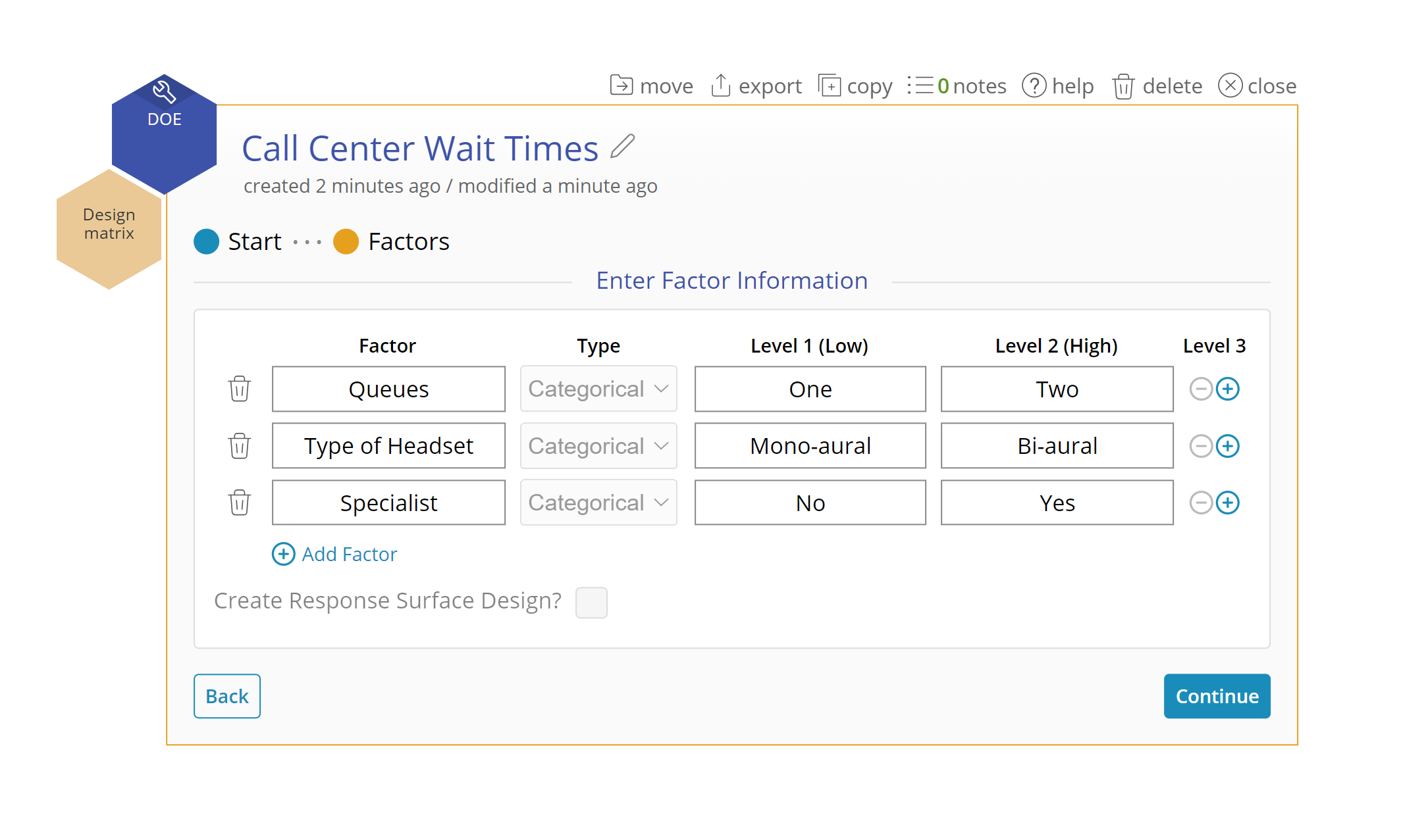 The number and types of factors will help determine the design. Input level names for easy identification for gathering and analyzing your data.