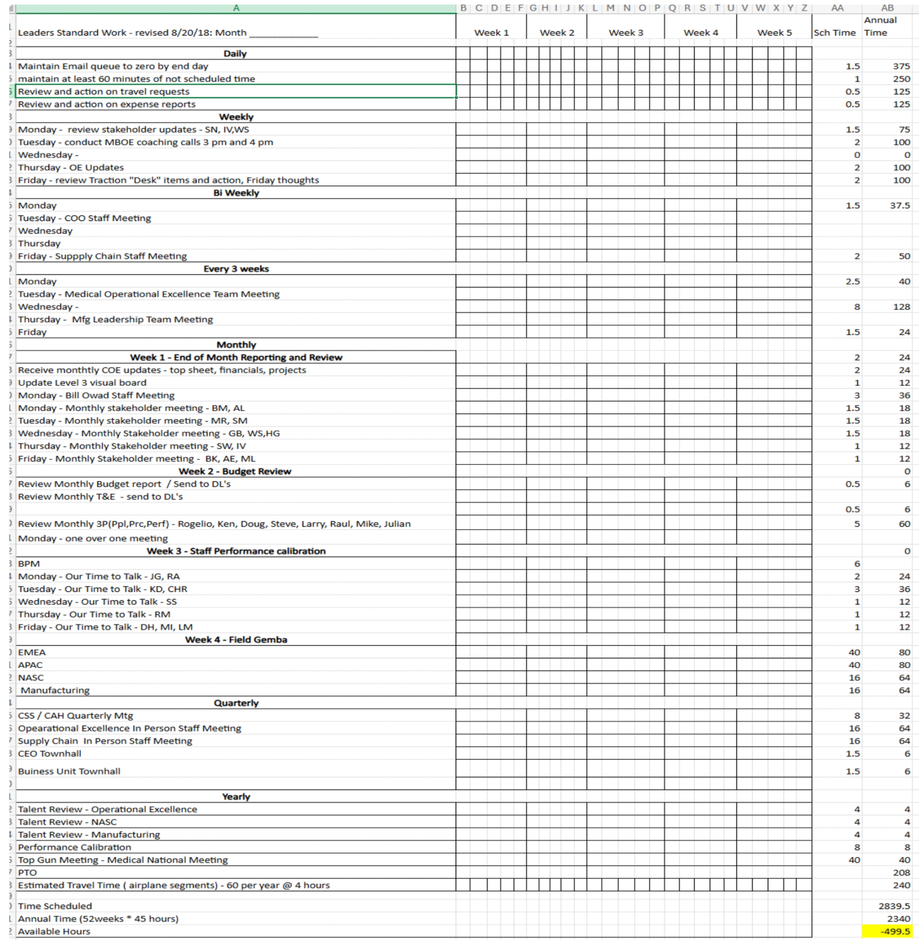The harsh reality is any time spent on urgent but not important issues and tasks is time lost, resulting in days filled with busy work that fail to deliver the results needed. Sustaining leader standard work with a living document takes your normal bias and makes sure you are focused on getting important things done. Daily, weekly, and monthly.