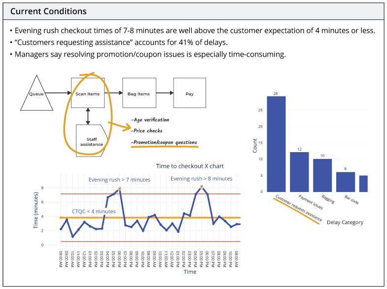 Describe what’s happening right now. Use data, charts, process maps, and visuals to paint a clear, shared picture of the current state. This section should answer: What exactly is the problem? How big is it? Where and when does it occur?